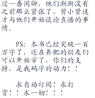 经过一番闲聊,他们渐渐没有之前那么紧张了,曾小贤这才与他们开始谈论直播的事情。