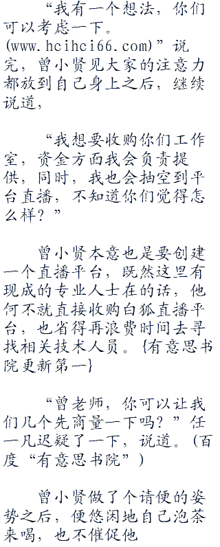 曾小贤本意也是要创建一个直播平台,既然这里有现成的专业人士在的话,他何不就直接收购白狐直播平台,也省得再浪费时间去寻找相关技术人员。