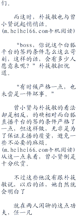 曾小贤与朴筱敏的看法却是相反,的确相对而白狐直播平台的签约条件严格了一点,但这样做,无非是为了保证主播的质量,避免一些不必要的麻烦。从这一点来看,曾小贤倒是十分欣赏。