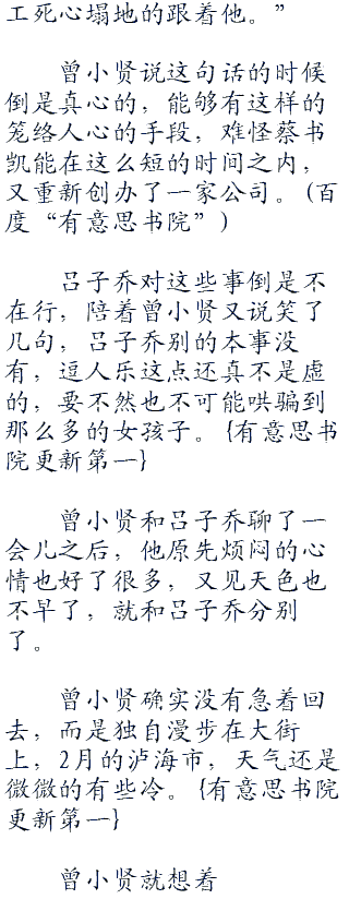 曾小贤说这句话的时候倒是真心的,能够有这样的笼络人心的手段,难怪蔡书凯能在这么短的时间之内,又重新创办了一家公司。