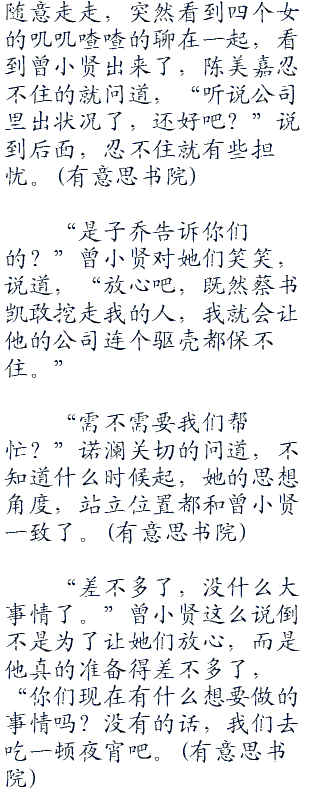 曾小贤就想着随意走走,突然看到四个女的叽叽喳喳的聊在一起,看到曾小贤出来了,陈美嘉忍不住的就问道,“听说公司里出状况了,还好吧?”说到后面,忍不住就有些担忧。