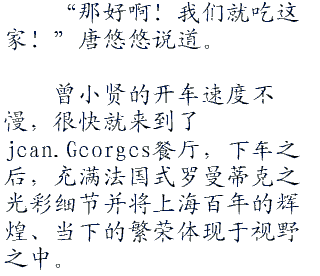 曾小贤的开车速度不慢,很快就来到了餐厅,下车之后,充满法国式罗曼蒂克之光彩细节并将上海百年的辉煌、当下的繁荣体现于视野之中。