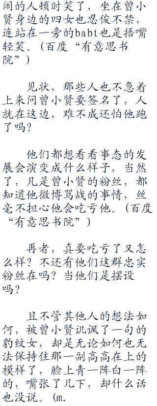 他们都想看看事态的发展会演变成什么样子,当然了,凡是曾小贤的粉丝,都知道他微博骂战的事情,丝毫不担心他会吃亏他。