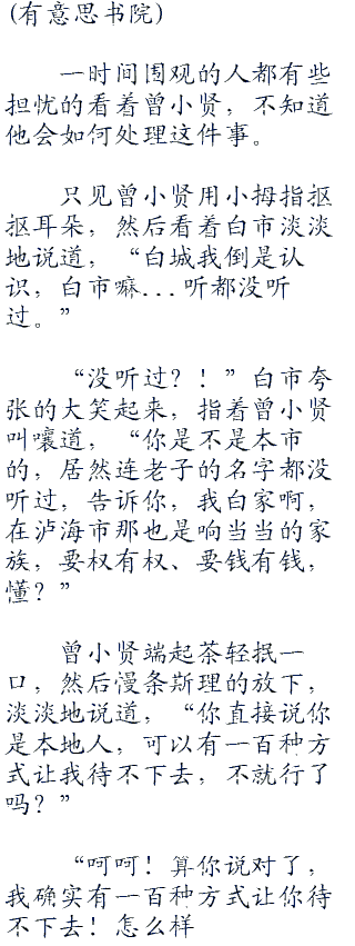 只见曾小贤用小拇指抠抠耳朵,然后看着白市淡淡地说道,“白城我倒是认识,白市嘛...听都没听过。”