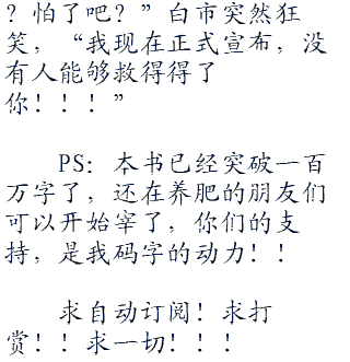 PS:本书已经突破一百万字了,还在养肥的朋友们可以开始宰了,你们的支持,是我码字的动力!!