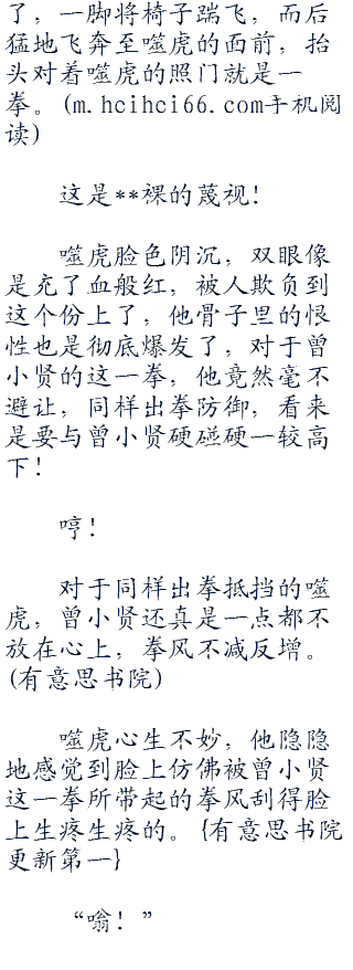 噬虎这句话,无疑是更加点燃了曾小贤心中的怒火,当下,曾小贤啪的一起站起来,一句废话都懒得多说了,一脚将椅子踹飞,而后猛地飞奔至噬虎的面前,抬头对着噬虎的照门就是一拳。