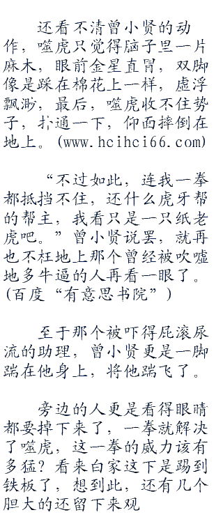 “不过如此,连我一拳都抵挡不住,还什么虎牙帮的帮主,我看只是一只纸老虎吧。”曾小贤说罢,就再也不枉地上那个曾经被吹嘘地多牛逼的人再看一眼了。