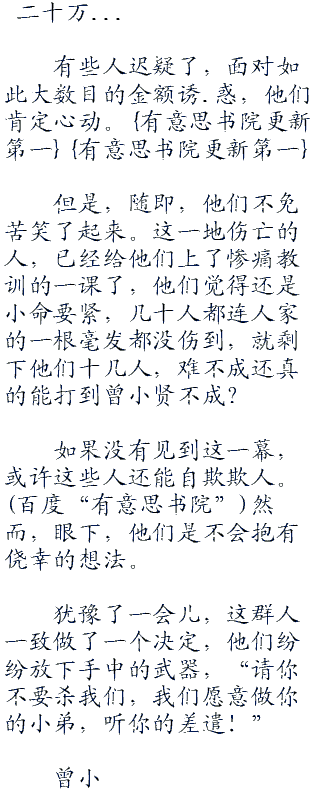 但是,随即,他们不免苦笑了起来。这一地伤亡的人,已经给他们上了惨痛教训的一课了,他们觉得还是小命要紧,几十人都连人家的一根毫发都没伤到,就剩下他们十几人,难不成还真的能打到曾小贤不成?