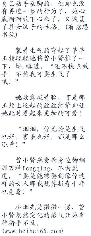 柳烟见曾小贤虽然对自己动手动脚的,但却也没有再进一步的行为了,她心底渐渐放下心来了,又恢复了其女汉子的性格。