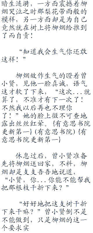 休息过后,曾小贤准备先将柳烟送回家,不料,柳烟却是支支吾吾地说道,“小贤,你...你能不能帮我把那根枝干折下来?”