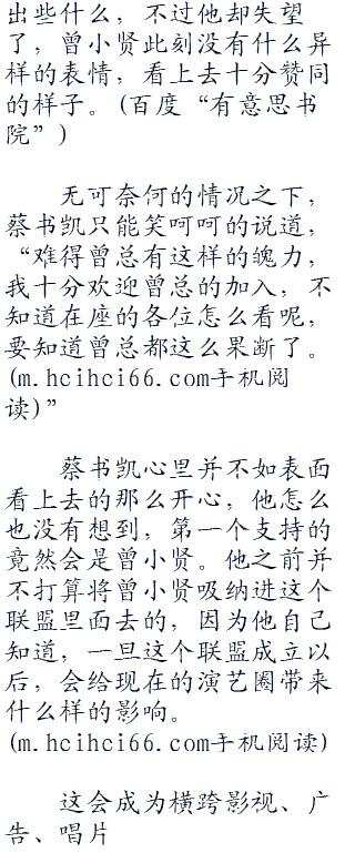蔡书凯心里并不如表面看上去的那么开心,他怎么也没有想到,第一个支持的竟然会是曾小贤。他之前并不打算将曾小贤吸纳进这个联盟里面去的,因为他自己知道,一旦这个联盟成立以后,会给现在的演艺圈带来什么样的影响。
