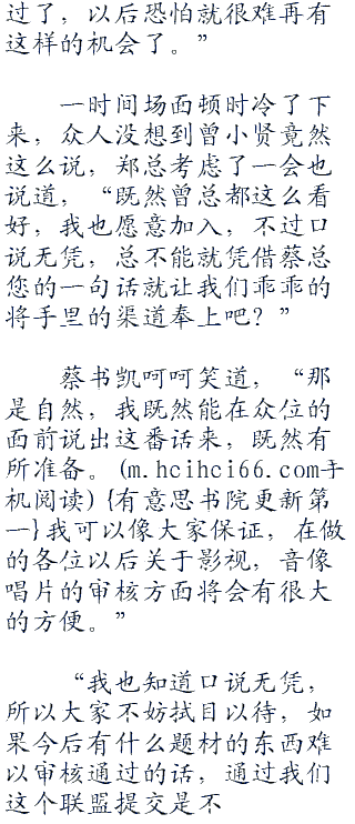 “我也知道口说无凭,所以大家不妨拭目以待,如果今后有什么题材的东西难以审核通过的话,通过我们这个联盟提交是不是容易些。而在此之前,我不会从众位的手中分享到渠道这些方面的任何好处,不知到大家意下如何呢?”