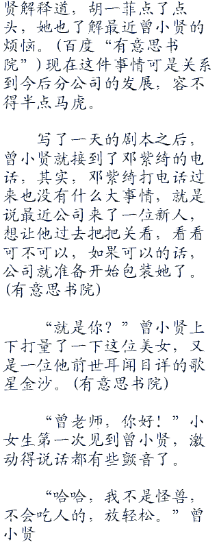 写了一天的剧本之后,曾小贤就接到了邓紫绮的电话,其实,邓紫绮打电话过来也没有什么大事情,就是说最近公司来了一位新人,想让他过去把把关看,看看可不可以,如果可以的话,公司就准备开始包装她了。