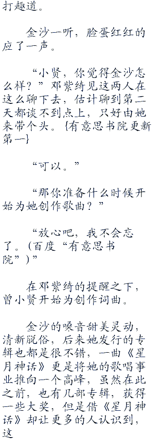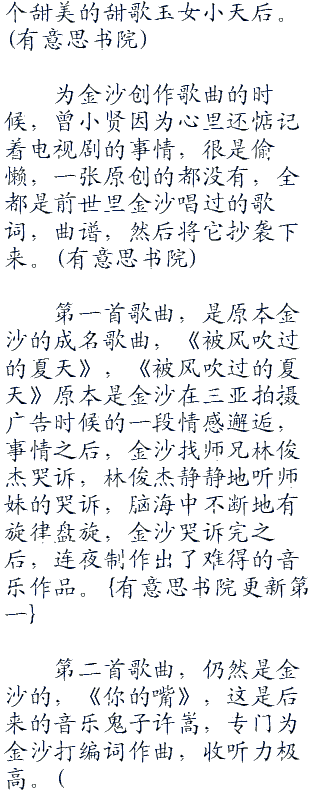 为金沙创作歌曲的时候,曾小贤因为心里还惦记着电视剧的事情,很是偷懒,一张原创的都没有,全都是前世里金沙唱过的歌词,曲谱,然后将它抄袭下来。