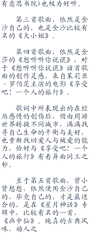 至于第五首歌曲,曾小贤想想,依然使用金沙自己的,毕竟自己的,才是最适合的,是在《星月神话》专辑中,比较有名的一首,《画中仙》。纯真的古典风味,动人之极。
