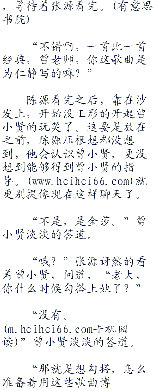 陈源继续看起了曲谱,一边翻看着,一边不经意的发出哼唱,曾小贤见张源没有较真,也没意思再笑下去,就躺在沙发上,等待着张源看完。