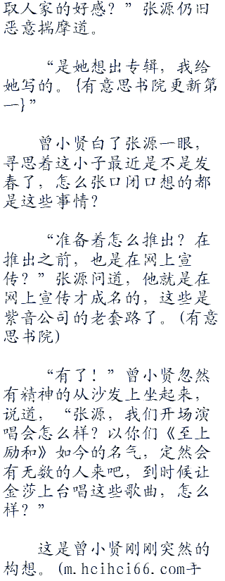 “有了!”曾小贤忽然有精神的从沙发上坐起来,说道,“张源,我们开场演唱会怎么样?以你们《至上励和》如今的名气,定然会有无数的人来吧,到时候让金莎上台唱这些歌曲,怎么样?”