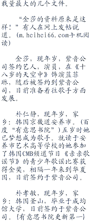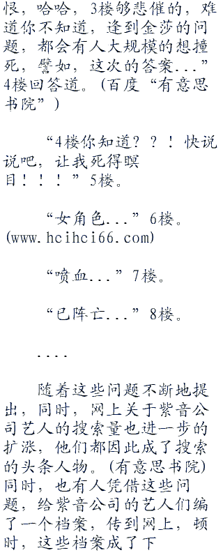 随着这些问题不断地提出,同时,网上关于紫音公司艺人的搜索量也进一步的扩涨,他们都因此成了搜索的头条人物。同时,也有人凭借这些问题,给紫音公司的艺人们编了一个档案,传到网上,顿时,这些档案成了下载量最大的几个文件。