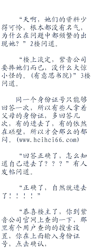 “恭喜楼主了,你到紫音公司官网上查询一下,那里有个用户查询的搜索设置,你在上面输入身份证号,点击确认,就会说你进没有。”3楼。