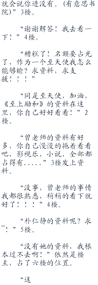 “同是至天使,加油,《至上励和》的资料在这里,你自己好好看看!”2楼。
