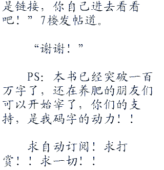 PS:本书已经突破一百万字了,还在养肥的朋友们可以开始宰了,你们的支持,是我码字的动力!!