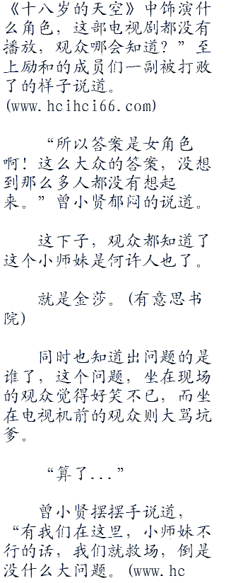 “都怪你啦,出的什么题目,什么请问金莎在《十八岁的天空》中饰演什么角色,这部电视剧都没有播放,观众哪会知道?”至上励和的成员们一副被打败了的样子说道。