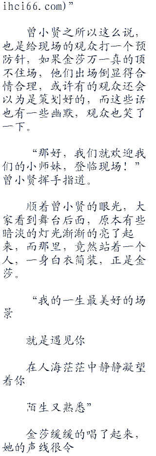 金莎缓缓的唱了起来,她的声线很令人舒服,不同于之前欢乐的《小苹果》,这是一首抒情曲,观众们静静地聆听。