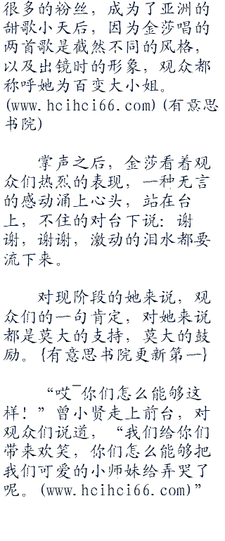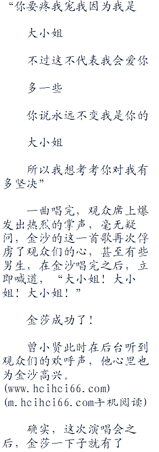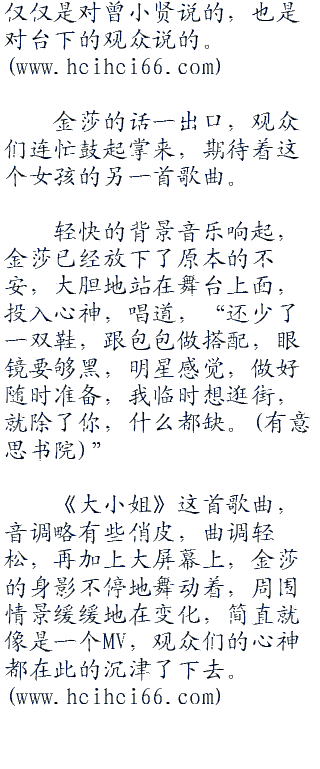 金莎克服了初时的怯场,投入感情,放开自己的心灵,放声歌唱。看⊙毛⊙线⊙小⊙说