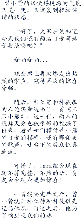 一首演唱完毕之后,曾小贤就让朴仁静和朴筱敏先退场休息,再这之后,他为了响应观众们的热烈的要求,又为大家跳了一段独创的舞步,博得了今晚观众的最热烈掌声...