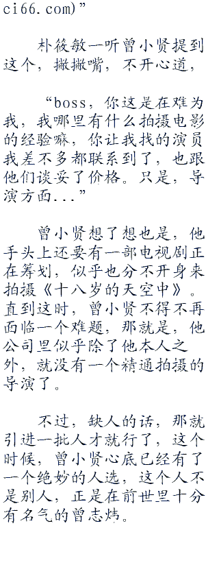 曾小贤想了想也是,他手头上还要有一部电视剧正在筹划,似乎也分不开身来拍摄《十八岁的天空中》。直到这时,曾小贤不得不再面临一个难题,那就是,他公司里似乎除了他本人之外,就没有一个精通拍摄的导演了。
