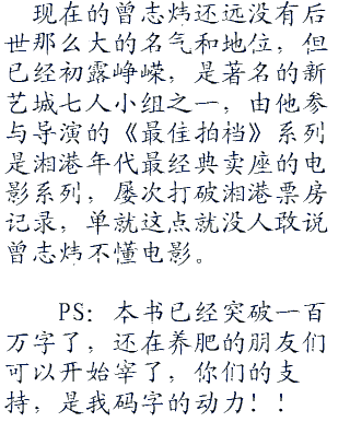 现在的曾志炜还远没有后世那么大的名气和地位,但已经初露峥嵘,是著名的新艺城七人小组之一,由他参与导演的《最佳拍档》系列是湘港80年代最经典卖座的电影系列,屡次打破湘港票房记录,单就这点就没人敢说曾志炜不懂电影。
