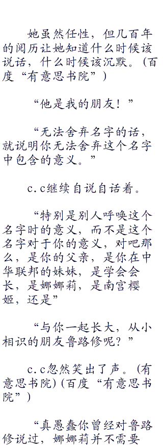 “那么,c.c为什么你是c.c呢?因为与过去彻底的斩断,抛弃了姓氏与名字,换了一个如同代号一样的,不知所谓的东西,这就是你的成熟吗?”