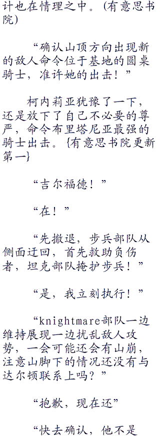 “我们要在山顶对布里塔尼亚军发动奇袭,你们全部听从我的指挥,一口气向第三地点冲去,此次作战目的是逮捕布里塔尼亚第二皇女柯内莉亚!”