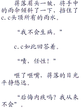夜晚的雨水洒下,给人带来阵阵凉意,蒋落将雨伞高举过头顶,一边奔跑一边抱怨着,“这是你的约会吧,鲁鲁??为什么我要和你一起来啊!”