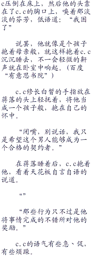 蒋落躺在c.c的身边,他双手枕在脑后,看着天花板。