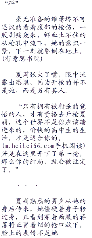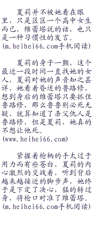 在zero的身旁不远处正掉着一把手枪,夏莉颤颤巍巍的走过去,用手哆哆嗦嗦的将手枪举起,枪口轻抬,对准了zero。
