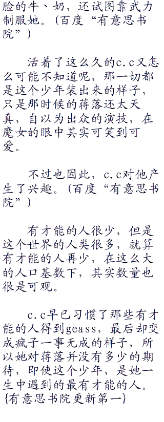 犹记得在布里塔尼亚皇宫见到他时的惊愕,中华联邦的皇室竟然会出现这么一个拥有才能的孩子,她犹记得在白羊宫前的草坪上,当时年仅七岁的蒋落泼了她一