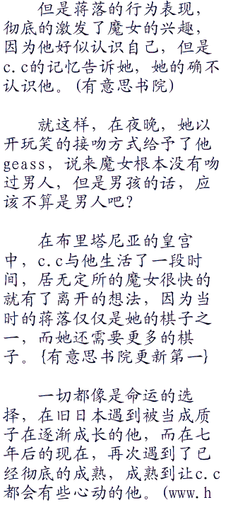蒋落迅速的答话,要知道能让这个魔女给你讲故事可是非常难得的事,大多数的人她可都是完全不搭理的,从这点来说,就知晓c.c对蒋落态度的不同。