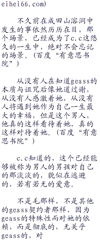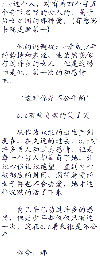 她清楚的感觉到,自己那颗早已死寂的,早已陷入绝望的心脏,再次跳动了起来,那跳动的心脏是如此的澎湃,它貪婪的吸收着阳光,让已经对一切再无感觉,只是沉默的看着世界的c.c,再次感觉到了少女才有的冲动。