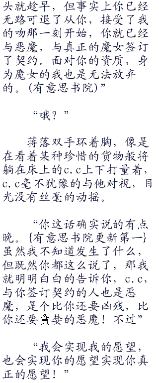 c.c完全没有自己被男人逼进无人的角落所应有的惊慌,而是施施然的躺在了他的床上。
