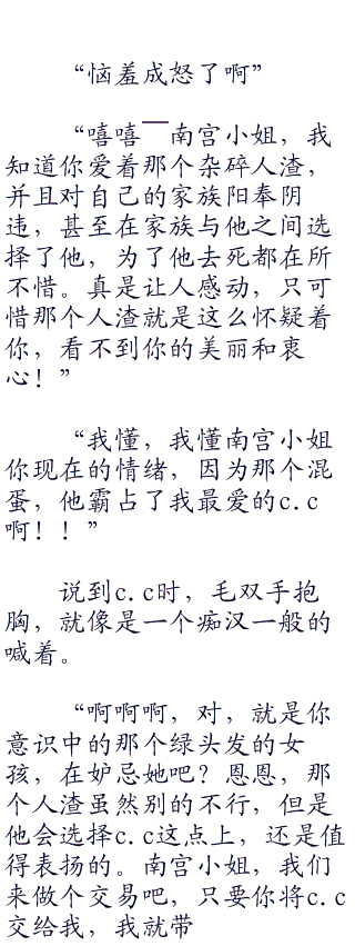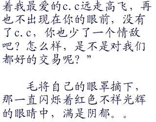 毛的脸色狰狞起来,想到蒋落对c.c做过的事,他就愤怒的想要杀人。