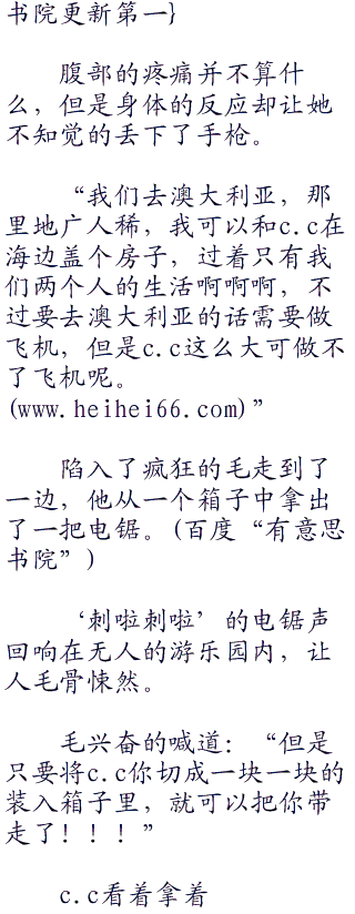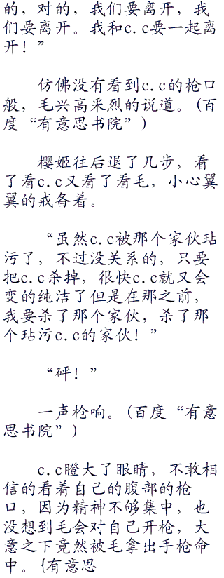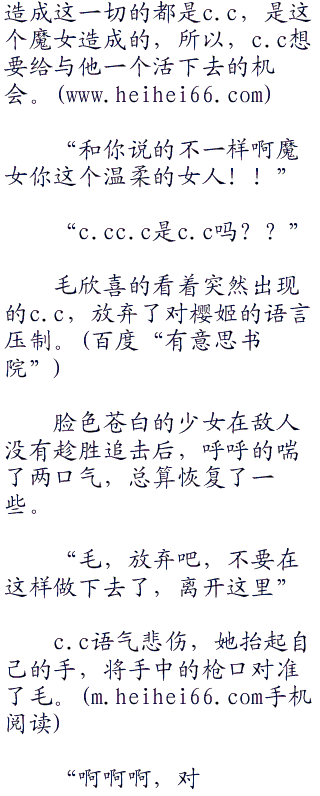蒋落咬着嘴唇,以狙击枪的穿透力,只要开枪,弹头就会穿透c.c的身体将毛射杀,但是,他的手有着颤抖,他根本无法扣下扳机啊。