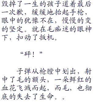 接到命令的一瞬间,樱姬就像是军人般站直了身体,迅速的从身上掏出手枪,在毛痛苦而惊恐的眼神下,连续开了三枪,将他的两只手和另一只完好的腿打出了三个枪眼。