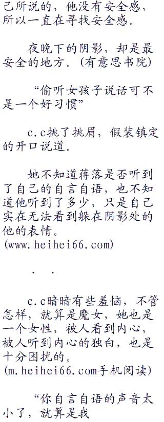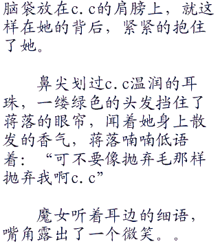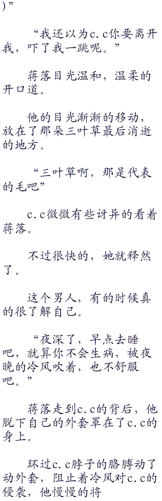 的确,她对他已经有了不同的感情,因为蒋落是c.c这么多年来,第一个走入她的内心,看到了她的记忆,甚至知道了她的名字的人。