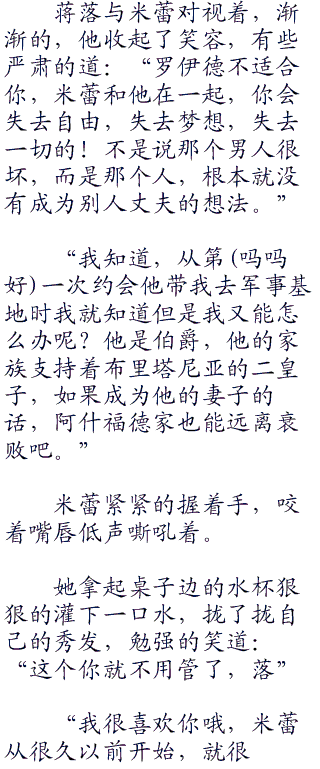 以往的蒋落在面对米蕾时,永远是温柔笑着,不管她怎么开恶作剧般的玩笑都从不动气,像是个‘小受’一样,但是如今米蕾才是发现,面前的人根本就是强势到了极点。