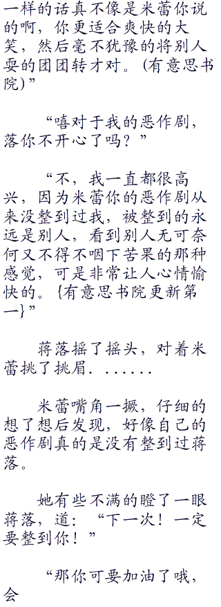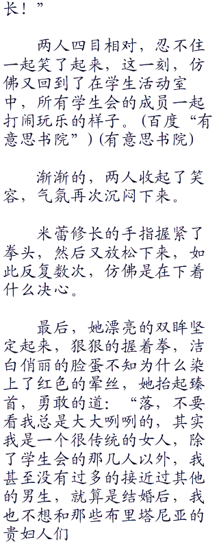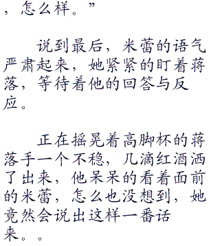 米蕾勇敢的与蒋落对视着,她深深的吸了一口气,像是下定了什么决心般决绝的道:“我喜欢你,落!”