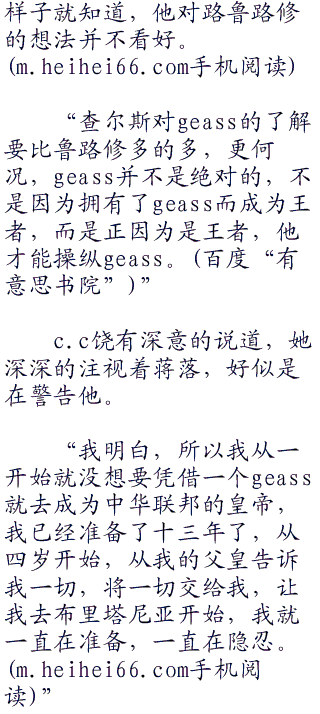“是啊,终于要去做了不过鲁路修的目的是想凭借这里的独立来刺激其他的殖民地,让所有的殖民地产生暴乱从而让布里塔尼亚手忙脚乱,他在伺机行动鲁路修的目的只是想要得到与查尔斯见面的机会,他恐怕觉得只要能够见面,就能用geass来解决掉自己的老爹吧。”