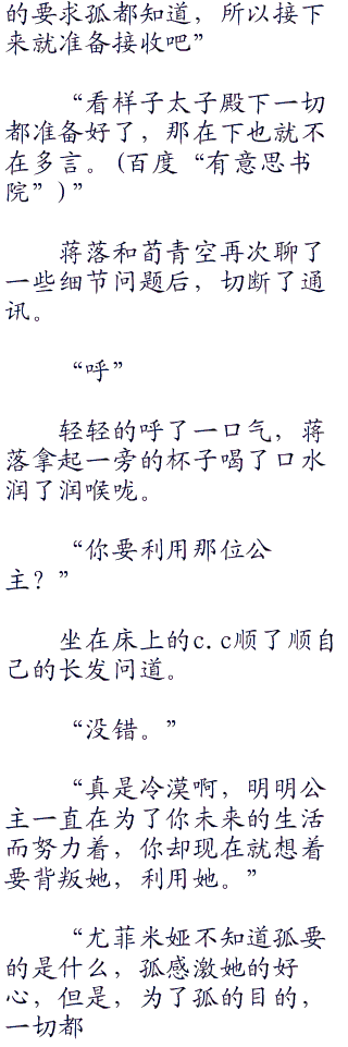 蒋落知道尤菲米娅说的是黑色骑士团的事,这位公主殿下有的时候也很自我,她完全不知道自己和鲁路修到底需要的是什么,就自顾自的以自己的好意来强加给别人。