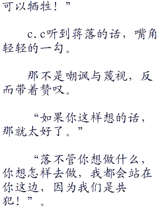 蒋落完全没有回避c.c,他从沙发上坐起来,换上了一副虚伪的笑脸,就算明知道电话那头的人看不到,他也依然要笑着。
