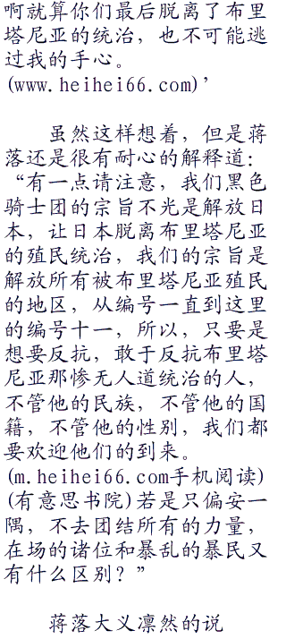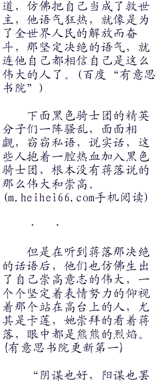 当然,这一切都跟蒋落的最终目的挂钩,所谓的黑色骑士团只是为了完成这个目的的工具,当计划彻底发动时,黑色骑士团到底是否能够存亡他根本不在乎。